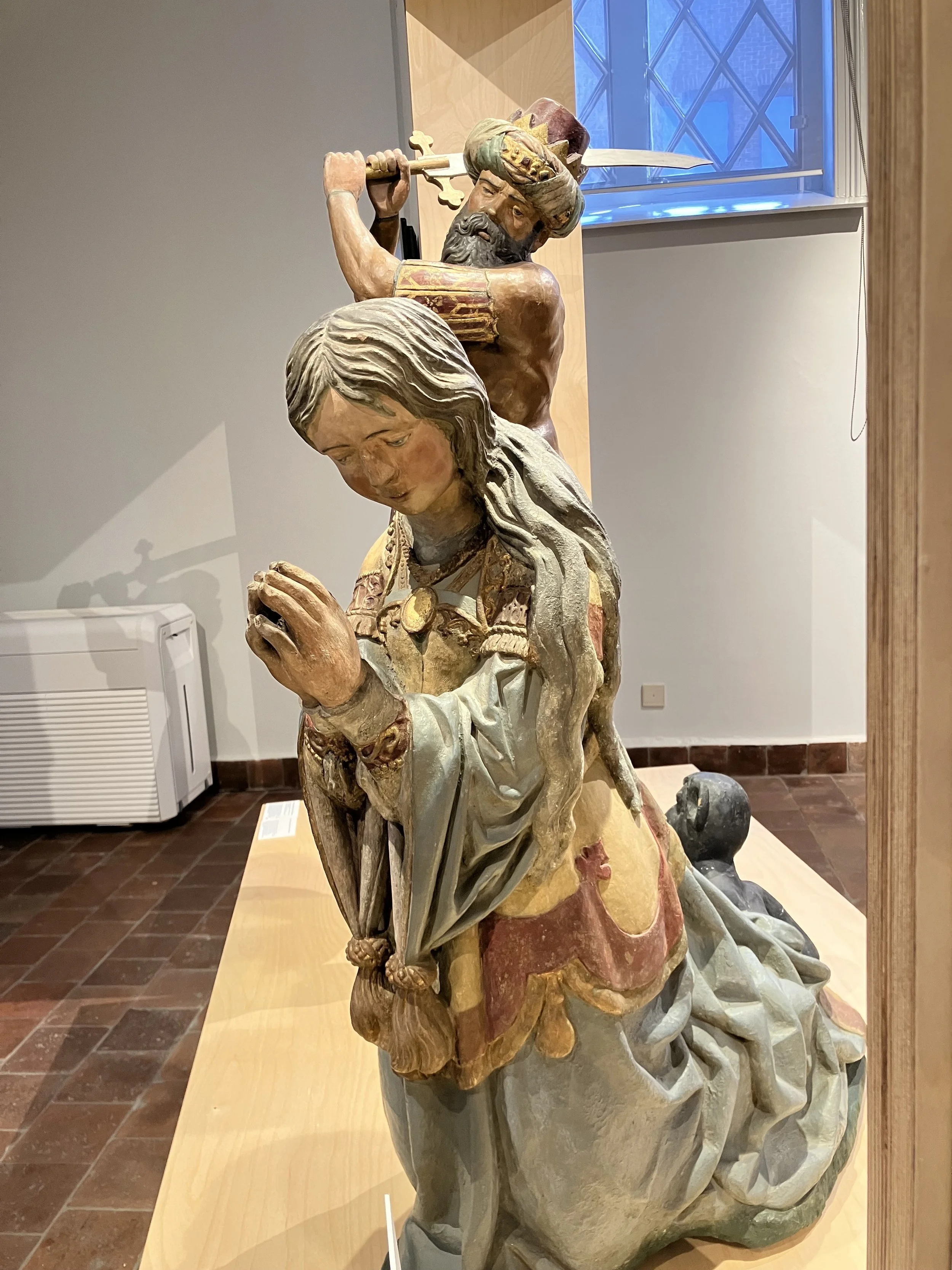 Sculpture group of the Martyrdom of Saint Dymphna. Dymphna, sandstone, Master Merten, early 16th century, 86 x 67 x 37 cm. King, wood, Thomas Hazaert, Mechelen (BE), 1609-1610, 124 x 44 x 30 cm. Gasthuismuseum Geel, Collection Gasthuiszusters Augustinessen Geel, inv. 03899.
