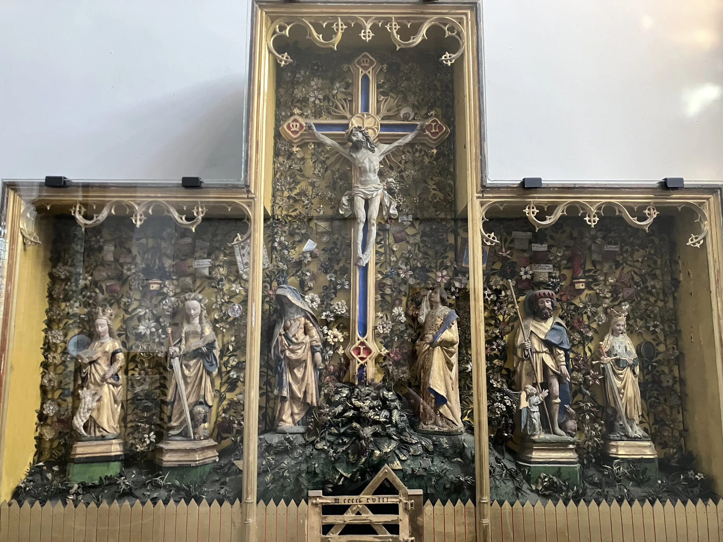 The colours of the Sint-Dimpnakerk enclosed garden are faded from light, though its components remain well intact. Six saints stand beneath a crucified Christ amid bright flowers, fabric relics, and pilgrim badges. The badges are camouflaged in the garden scene and difficult to see even from the vantage point of the altar. I returned to the church at different hours of daylight to look into the enclosed garden and found a new badge each time. Some badges are carefully sewn into the flowers surrounding them. Others are placed nearby other relics and appear as a sort of backdrop for the saints. Here badges live a second life different from their first one as pilgrim souvenirs.