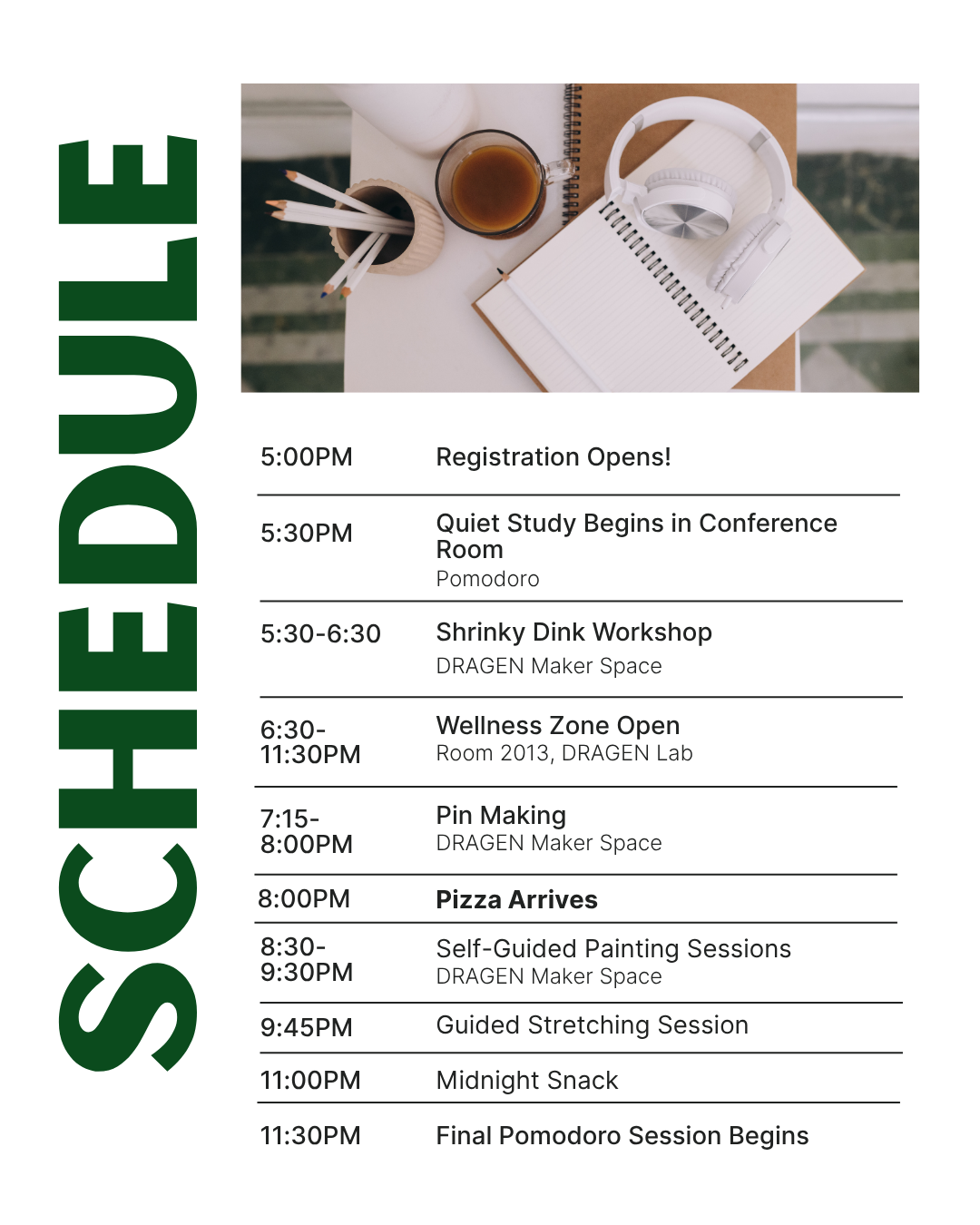 Looking to step beyond the traditional methods of studying at the end of term? This free event offers a quiet work environment, activities, free printing, free food and more!