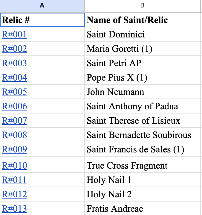 To view images of the relics please click on the Relic #, which is hyperlinked for each entry.